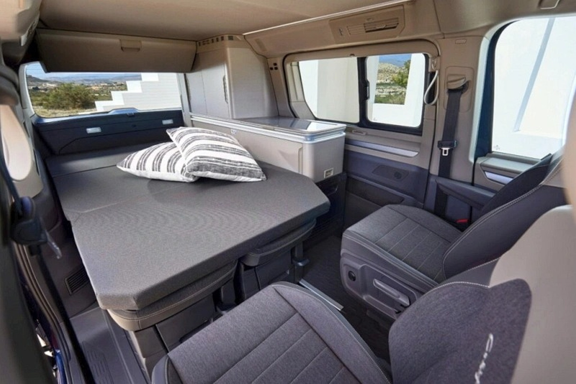 Na dole w krótkiej chwili powstaje drugie łóżko, co pozwala czterem dorosłym osobom spędzić noc w zaskakująco komfortowych warunkach. System jest prosty i intuicyjny, choć środkowy fotel drugiego rzędu nie składa się całkowicie na płasko, dlatego w praktyce przed dłuższą wyprawą najlepiej go zostawić w garażu. Jedziemy zatem w czteroosobowym składzie, a nie 2-3. To kompromis w zamian za funkcjonalność, która zmienia vana w mikroapartament.