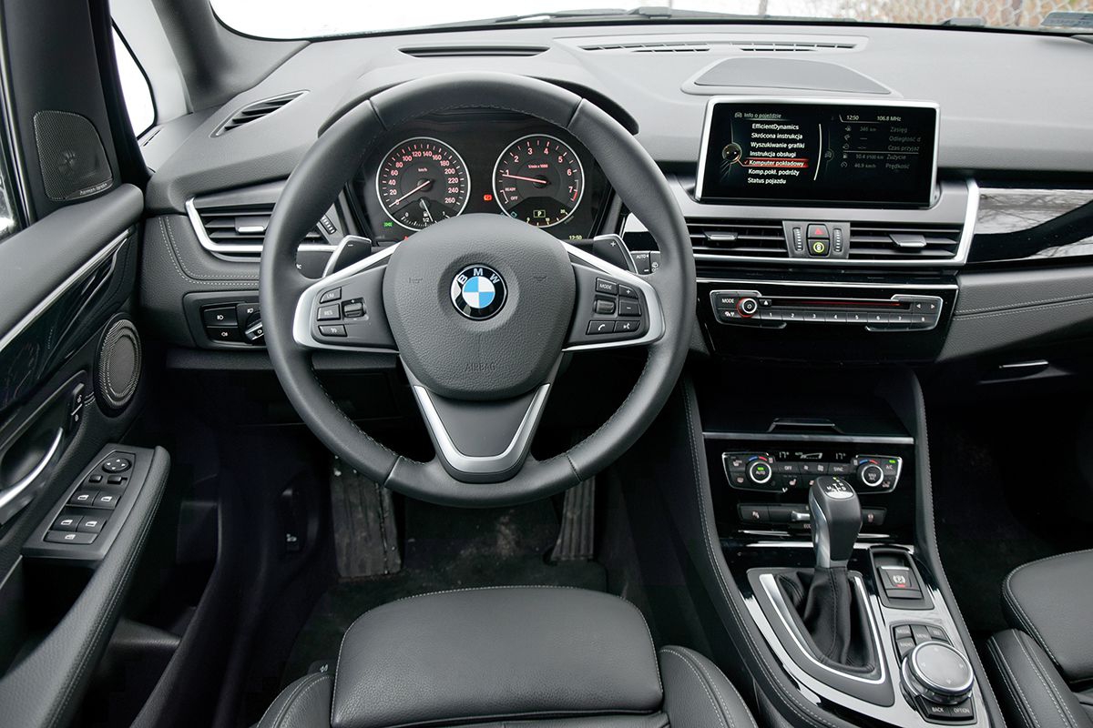 We wnętrzu modelu 2 Active Tourer czujemy się tak jak w każdym innym samochodzie bawarskiej marki. Typowa dla BMW aranżacja kabiny, z konsolą środkową wychyloną w kierunku kierowcy, znakomita ergonomia i jakość materiałów to od lat wizytówka niemieckiego producenta. Docenimy również przestrzeń w kabinie, tak w pierwszym, jak i w drugim rzędzie, oraz bardzo wygodne fotele. Model Active Tourer jest zatem pierwszym kompaktowym BMW, które w większym stopniu dopieszcza również pasażerów, a nie tylko kierowcę. Zgrzytem w nowym modelu jest tworzywo, jakim pokryto trójramienną kierownicę, które ma bardzo ostre kanty. Gdy spróbujemy obrócić kierownicę, trzymając nie za wieniec, a za ramię, to istnieje duża szansa, że się zadrapiemy lub skaleczymy.