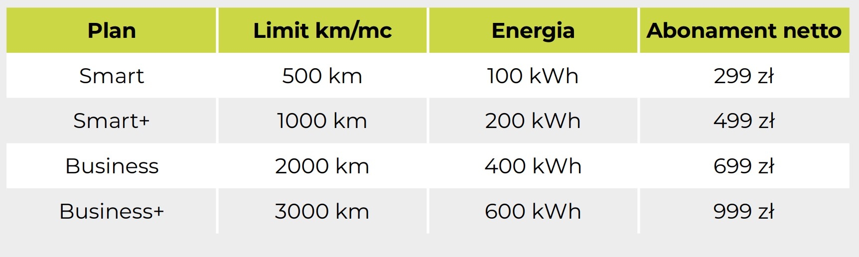 Dostępne plany obejmują limity od 500 do 3000 km miesięcznie, z cenami od 299 do 999 zł netto.