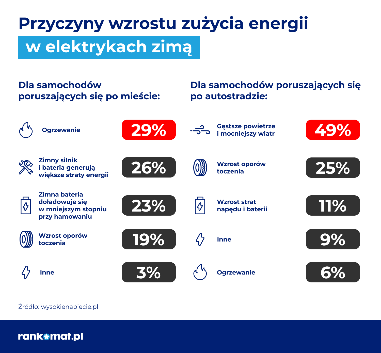 Na wzrosty zużycia energii w aucie elektrycznym zimą ma wpływ kilka czynników. Co więcej, zmieniają się one w zależności od tego czy samochód porusza się np. po mieście, czy też jest to droga ekspresowa. Według badania zrealizowanego przez serwis wysokienapiecie.pl, na spadek zasięgu w terenie zabudowanym wpływ ma wzrosty oporów toczenia (19%) - ze względu na zmiany temperatury zimowe opony są często niedopompowane, a nawierzchnia drogi zwykle bywa mokra, ogrzewanie (29%) czy też zimna bateria (zwłaszcza mocno naładowana), która przy hamowaniu doładowuje się w mniejszym stopniu (23%).