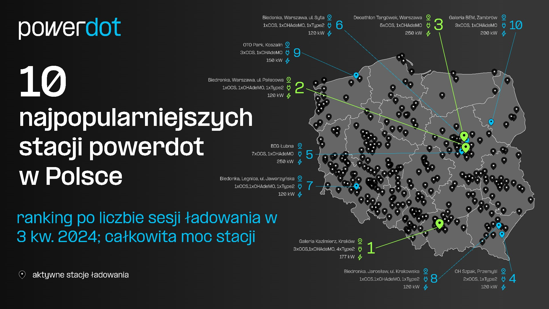 Na 10 najpopularniejszych stacjach odbyło się o 473% więcej sesji ładowania niż wynosiła średnia dla całej infrastruktury Powerdot w badanym okresie. W trzech najpopularniejszych lokalizacjach wykonano z kolei o 744% więcej ładowań niż wynosiła średnia dla całego kraju.