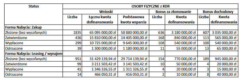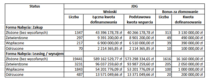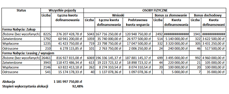 Do tego czasu wykorzystano 92,48 proc. środków. Odrzucono 751 wniosków, a złożono ich (zakup, leasing/wynajem) 34686. Zatwierdzono jednak tylko 5735, reszta czeka na akcept. Wypłacono jeszcze mniej, bo zaledwie do 3381 wniosków.