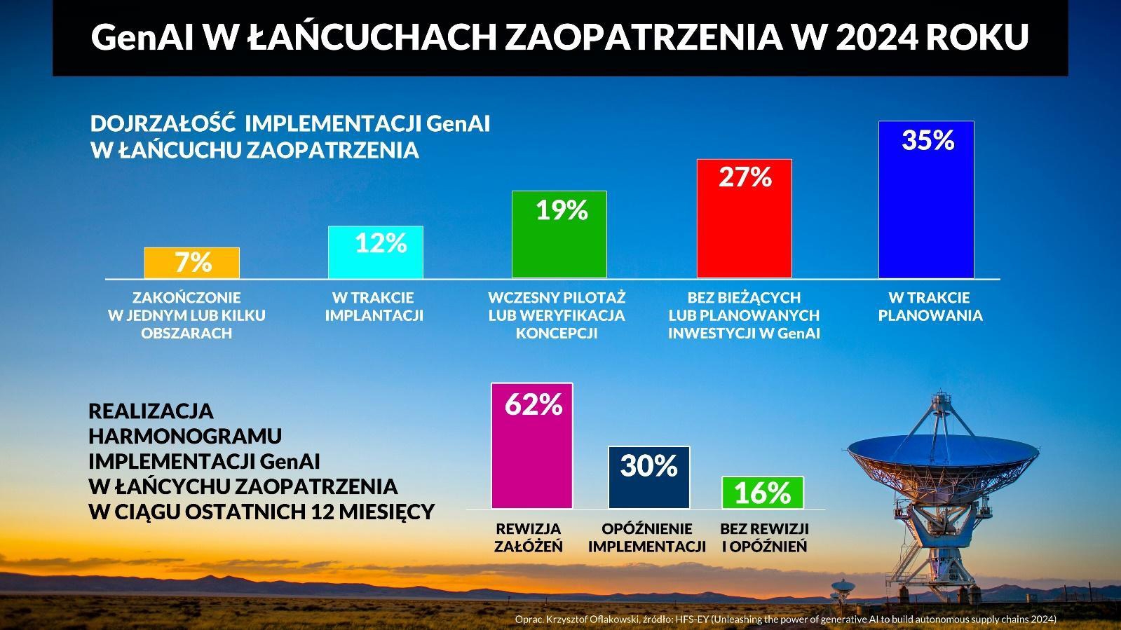 Fakt, że adaptacje rozwiązań generatywnej sztucznej inteligencji są dalece bardziej skomplikowane niż pierwotnie przyjmowane scenariusze potwierdzają analizy prowadzone w obszarze operacji logistycznych. Szczegółowych wniosków o problemach i wyzwaniach dotyczących wykorzystania potencjału sztucznej inteligencji, a zwłaszcza jej generatywnej formy, dostarcza m.in. HFS i EY w badaniu opracowanym na początku 2024 r. W globalnej analizie przeprowadzonej wśród 460 managerów wysokiego szczebla odpowiedzialnych za łańcuchy dostaw w organizacjach, których roczne przychody przekraczały 1 mld dol. wykazano m.in., że zaledwie 16% prób wdrożenia GenAI podejmowanych w ostatnich 12 miesiącach zakończyło się sukcesem. Oznacza to, że scenariusz implementacji nie został ani zmieniony, ani opóźniony z powodu napotkanych problemów lub ryzyka. Takiego szczęścia w ciągu ostatniego roku nie miało jednak 62% managerów, których programy GenAI trzeba było redefiniować. W przypadku 30% organizacji konieczne było także opóźnienie harmonogramu wdrożenia.