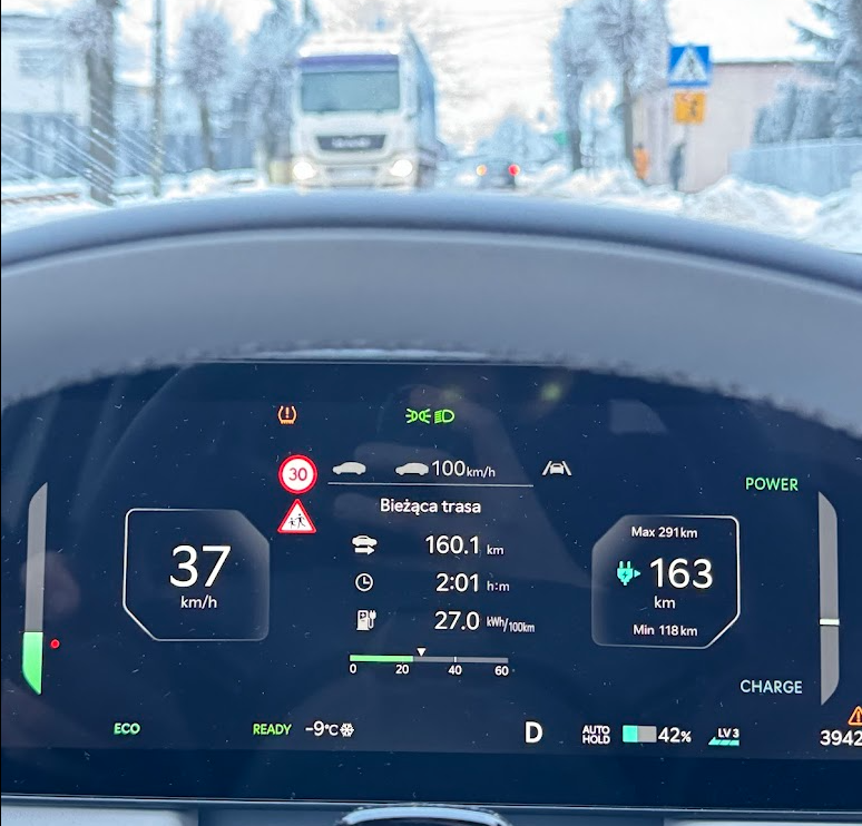 Trasa 156,8 km (40 km miasto plus S-ka w stronę Gdańska), czas 1 h 56 min, temperatura –10°C. Średnie zużycie: 27,3 kWh/100 km. Dokładnie tak, jak powinno być.