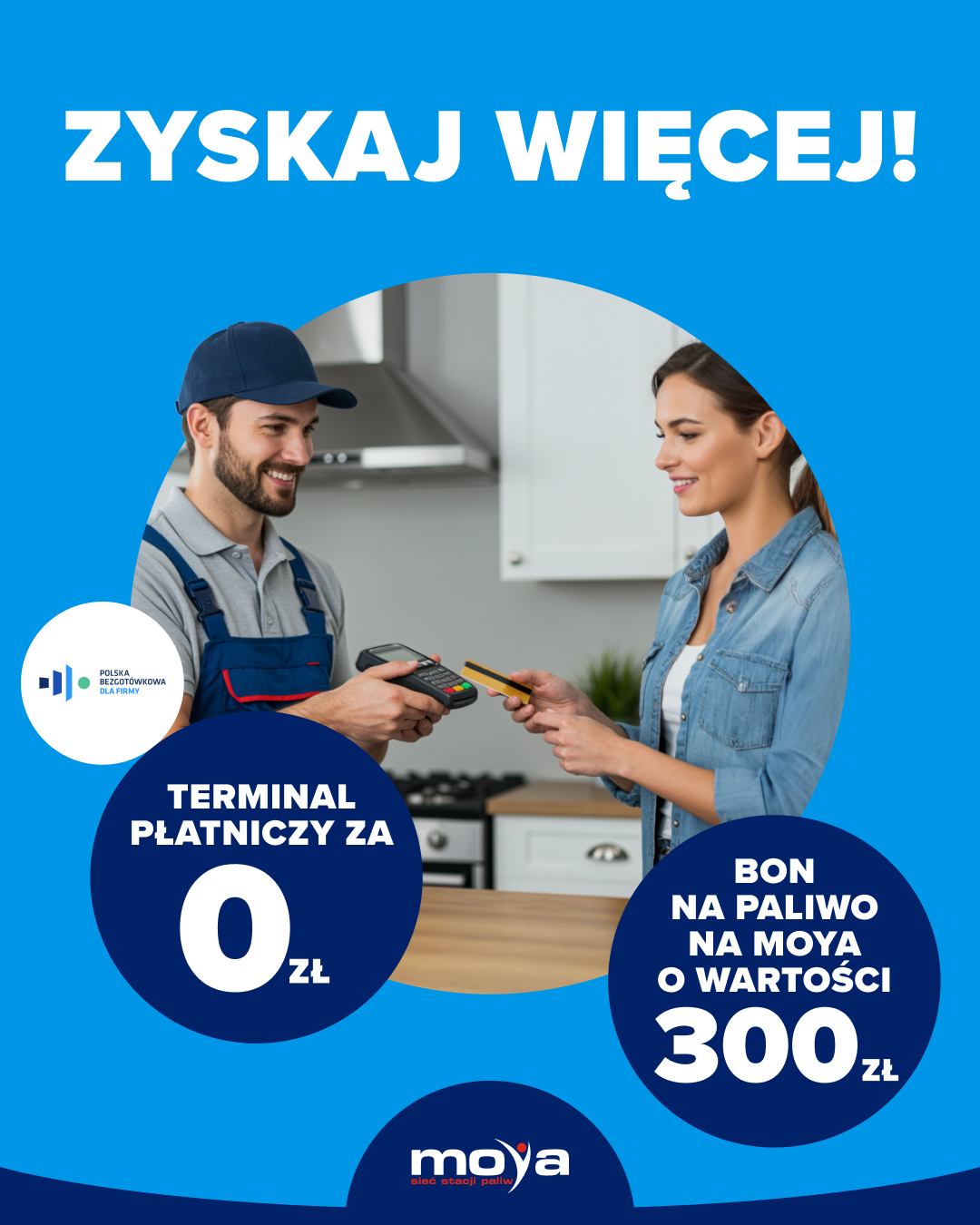 Właściciele małych i średnich firm, którzy jeszcze nie korzystają z płatności bezgotówkowych, mogą otrzymać terminal płatniczy, terminal w telefonie lub bramkę płatniczą do sklepu online z Programu Polska Bezgotówkowa realizowanego przez Fundację oraz dodatkowo zyskać bony o wartości 300 zł na paliwo do wykorzystania na stacjach paliw MOYA. Akcja potrwa od 4 sierpnia do 5 października 2025 r.