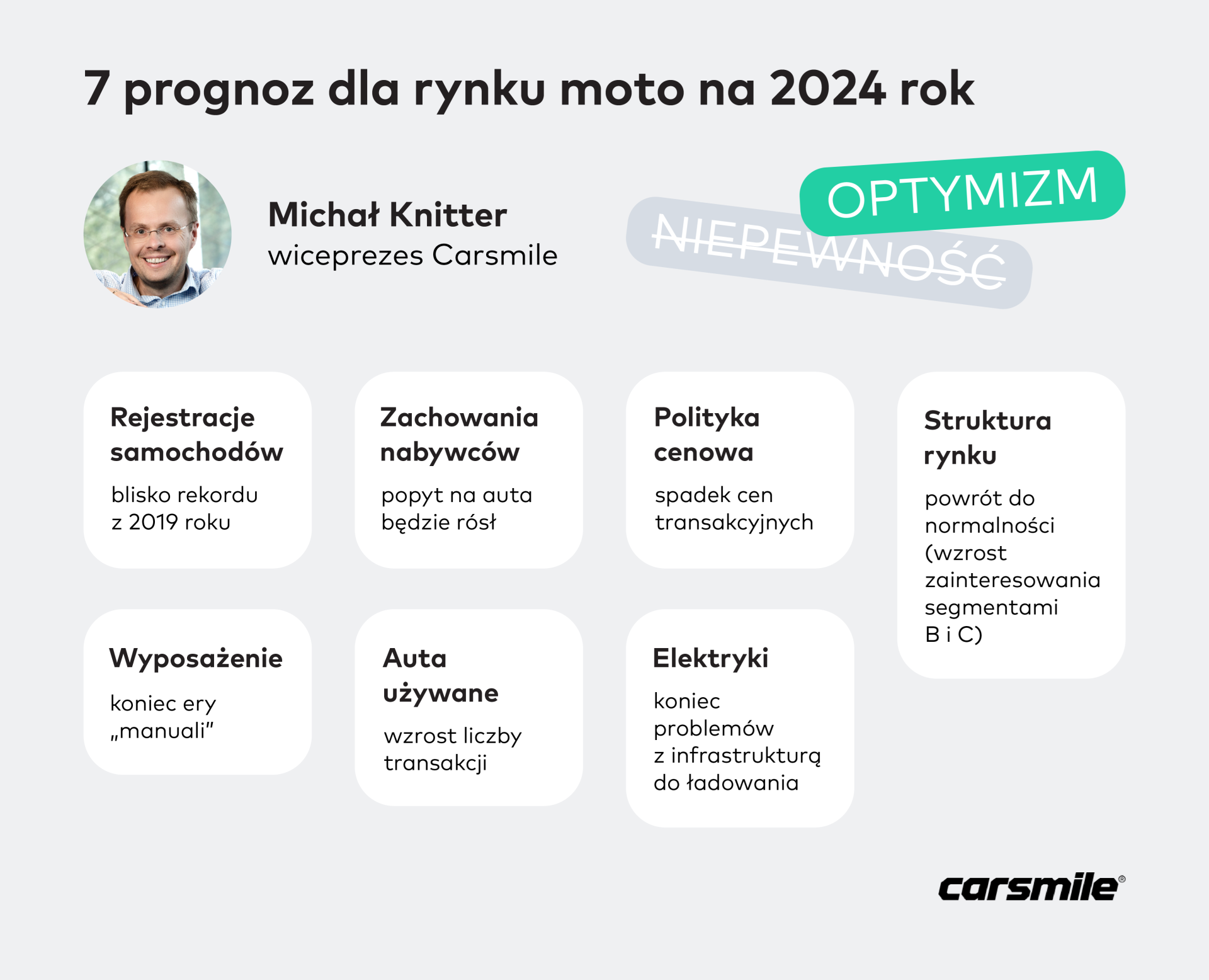 OPTYMIZM w miejsce niepewności, która była SŁOWEM KLUCZEM na rynku MOTORYZACYJNYM u progu 2023 roku. Wzrost popytu, rejestracje nowych aut bliskie rekordom, spadek cen transakcyjnych oraz koniec ery „manuali” – to zdaniem Michała Knittera, wiceprezesa Carsmile, czeka rynek moto w 2024 ROKU.