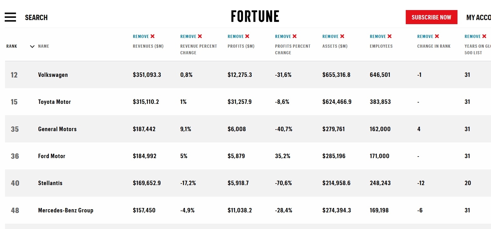 Ranking Fortune Global 500 zawiera zestawienie 500 najwiekszych światowych firm. W kategorii produkcji samochodów i części jest ich aż 35. Najwyżej znajduje się Volkswagen, który z 11 spadł na 12 pozycję ale nadal jest najwyżej. Toyota Motor utrzymała swoją pozycję i nadal znajduje się na miejsu 15.