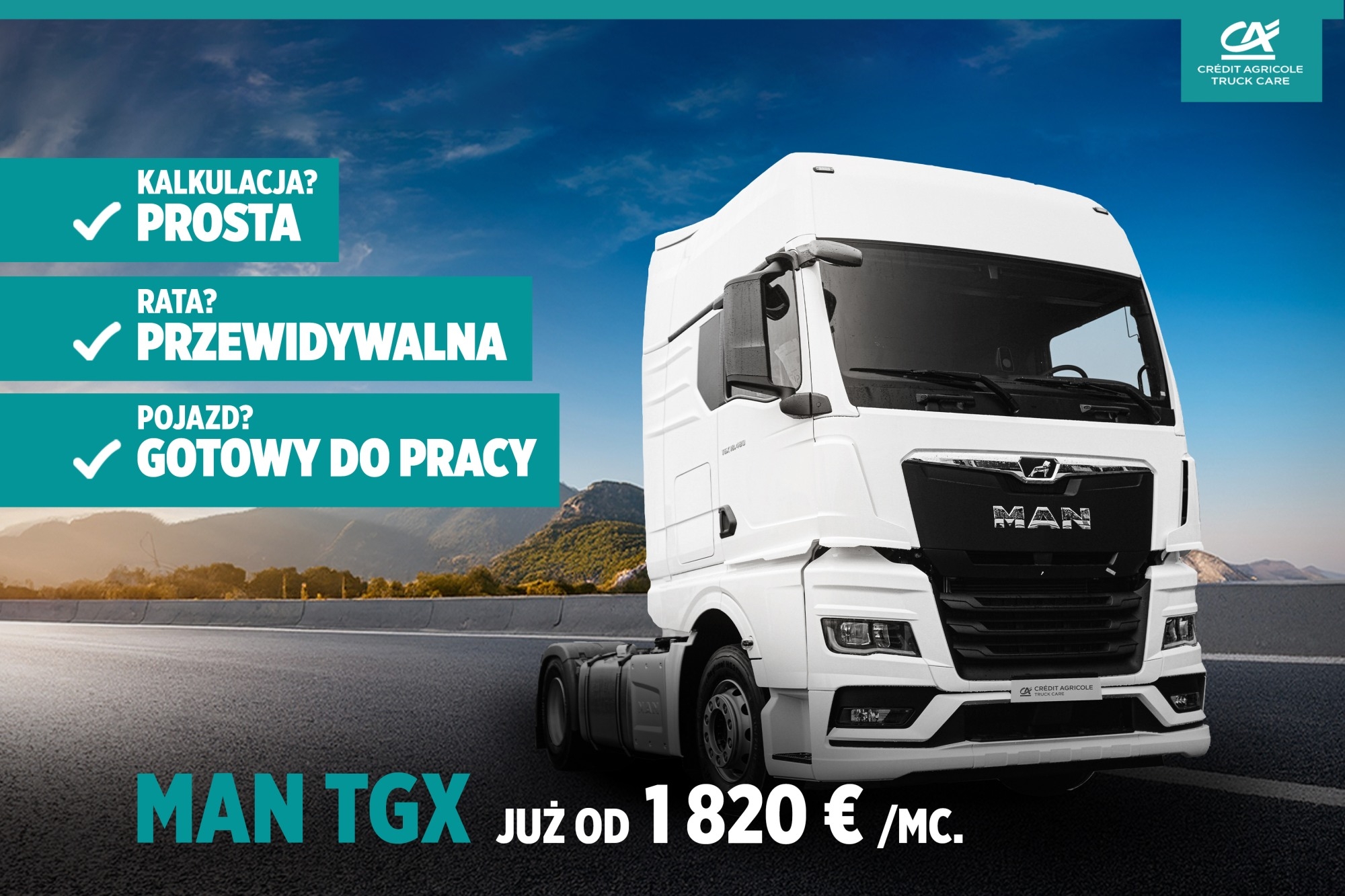 Truck Care uruchomił ofertę wynajmu długoterminowego nowego ciągnika MAN TGX 18.520. Nowoczesna ciężarówka zapewniająca wysoki komfort i bezpieczeństwo kierowcy jest wyposażona w silnik o mocy 520 KM gwarantujący doskonałe osiągi. W standardzie posiada klimatyzację postojową, pakiet oświetlenia LED oraz pneumatyczne komfortowe siedzenie kierowcy.