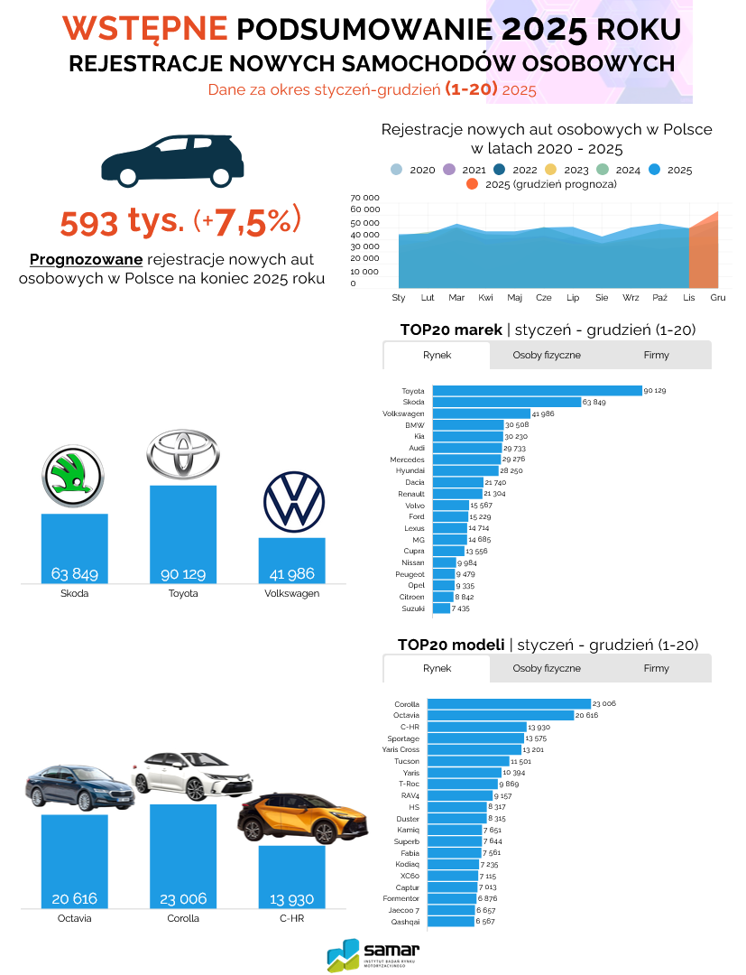 Samar już dzisiaj podsumowuje rok na polskim rynku nowych samochodów osobowych i dostawczych. Choć dane są do 20 grudnia i trochę może się jeszcze zmienić, pewne jest jedno. Rekordu z 1999 nie ma, a podium się już nie zmieni.