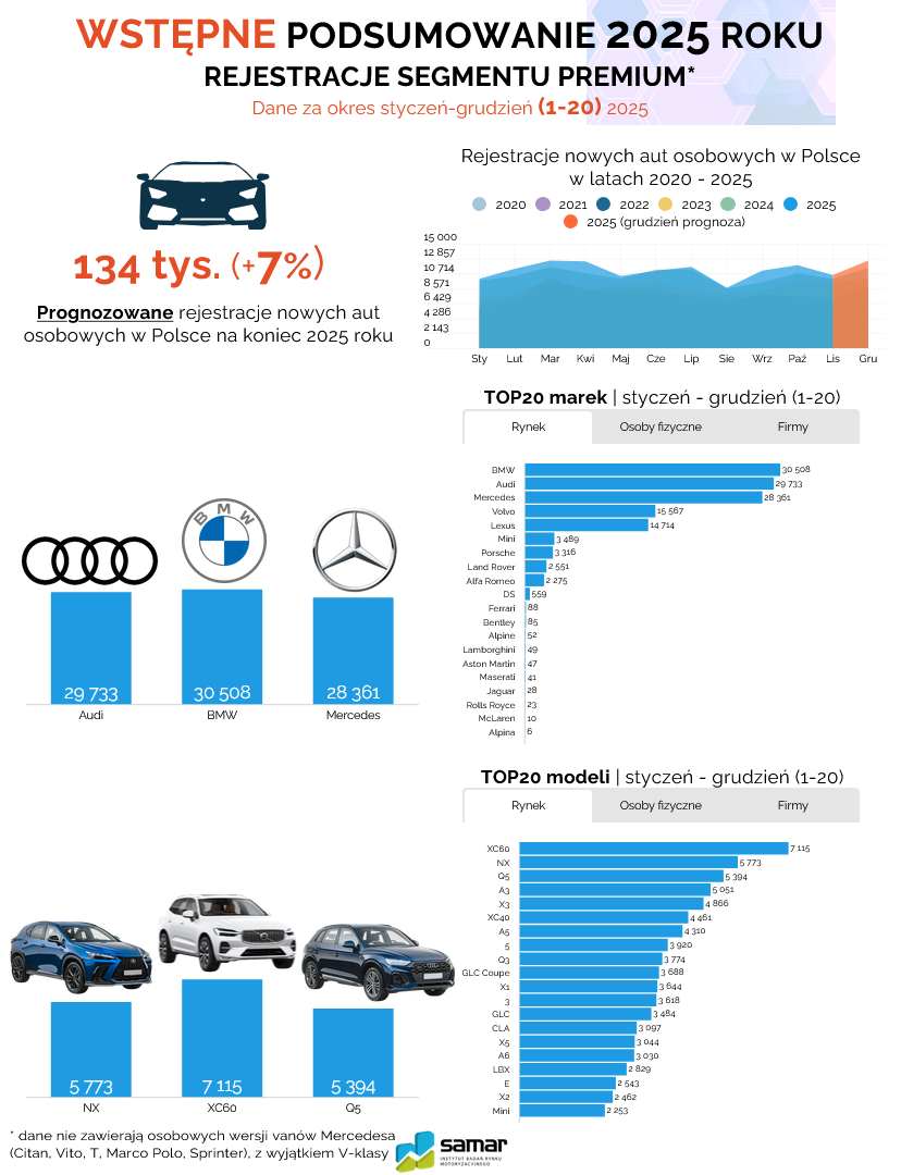 W sumie segment premium urośnie o 7 proc. Wynik 134 tys. sztuk był wcześniej nieosiągalny, a jak podkreśla Samar - to pierwszy rok bez Tesli w tej kategorii.