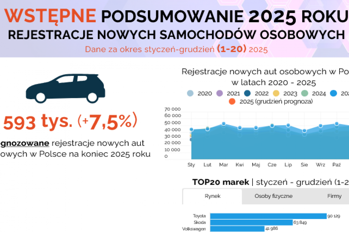 Jak wynika z danych, już w styczniu wykreowała się czołówka, która dojechała z wynikiem do końca roku. Niekwestionowanym liderem pozostaje Toyota, która zdominowała rynek nowych samochodów osobowych. Drugie miejsce zajęła Skoda, a trzecie Volkswagen.