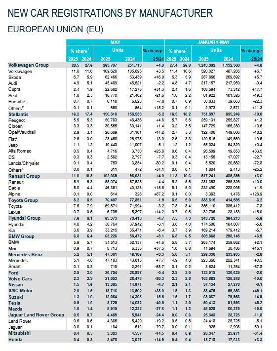Do końca maja 2025 r. liczba rejestracji nowych samochodów w UE obniżyła się o 0,6% w porównaniu z analogicznym okresem ubiegłego roku. Niemniej jednak rejestracje rok do roku w maju zwiększyły się o 1,6% w porównaniu z tym samym miesiącem ubiegłego roku. Narastająco na koniec maja udział w rynku samochodów elektrycznych wyniósł 15,4%, co nadal jest dalekie od oczekiwanego poziomu.