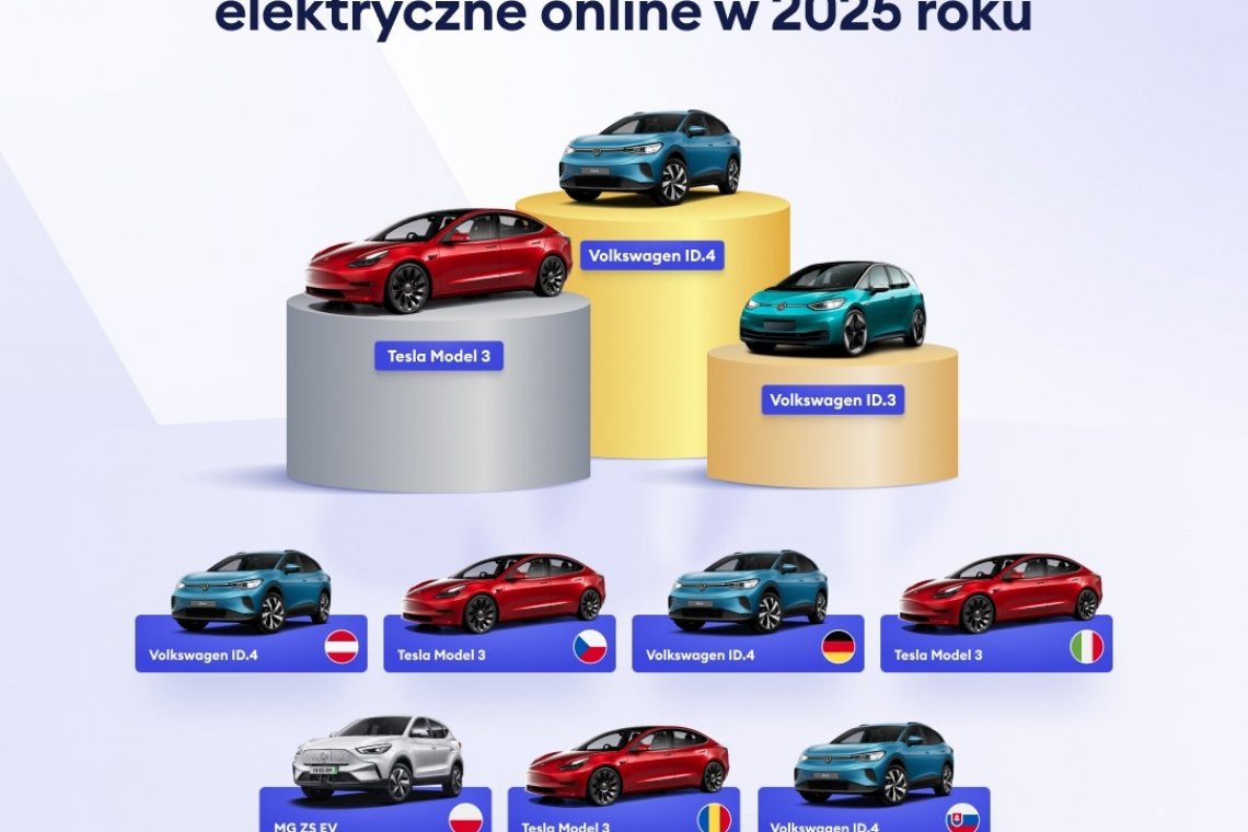 Typowy samochód elektryczny sprzedany w 2025 roku online miał w ujęciu medianowym trzy lata i przebieg 39 025 km. Patrząc na preferencje regionalne, widoczna jest dominacja modelu Volkswagen ID.4 w Niemczech, Austrii i na Słowacji.