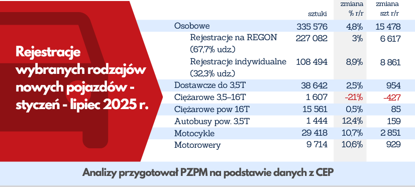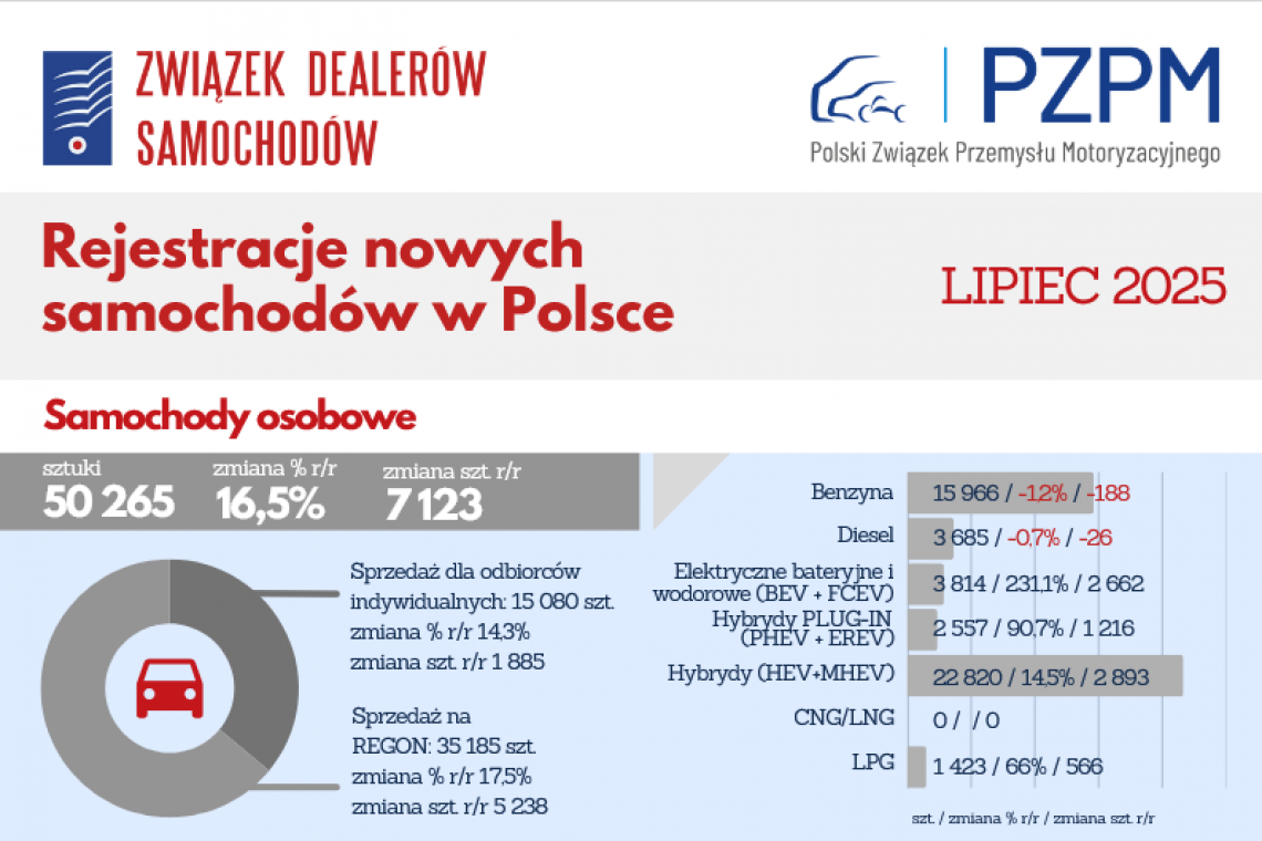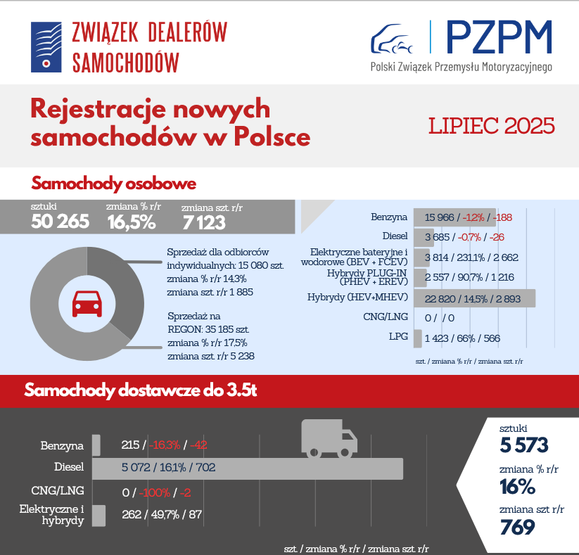 Coraz większy udział w rynku mają klienci indywidualni — obecnie to 32,3% wszystkich rejestracji. Wyjątkowo dynamicznie rośnie segment pojazdów elektrycznych i hybryd plug-in. W lipcu zarejestrowano 3 814 takich samochodów, co oznacza wzrost o 231% r/r, oraz 2 557 hybryd plug-in, co stanowi wzrost o 91% r/r. W pierwszych siedmiu miesiącach tego roku rejestracje samochodów elektrycznych i hybryd plug-in zwiększyły się łącznie o 80% w stosunku do roku ubiegłego.