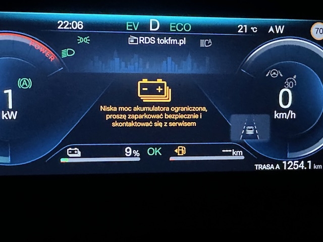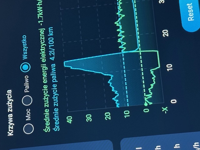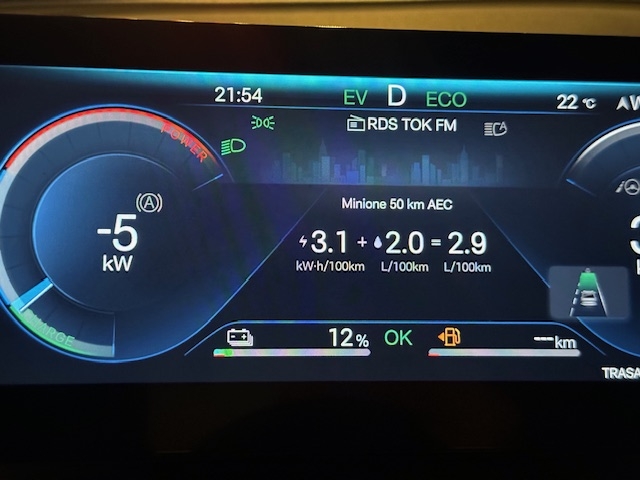 A co z tymi ostatnimi 150 kilometrami? Wtedy zrobiło się ciekawie. Auto pozwala doładować baterię, zużywając przy tym ciut więcej paliwa. Ale jak jedziesz szybciej to i tak jest niewielka różnica. Zatem tuż przed zużyciem całej benzyny doładowałem baterię i tak dojechałem dodatkowe 80 km, osiągając 1200 km na jednym tankowanio-ładowaniu.