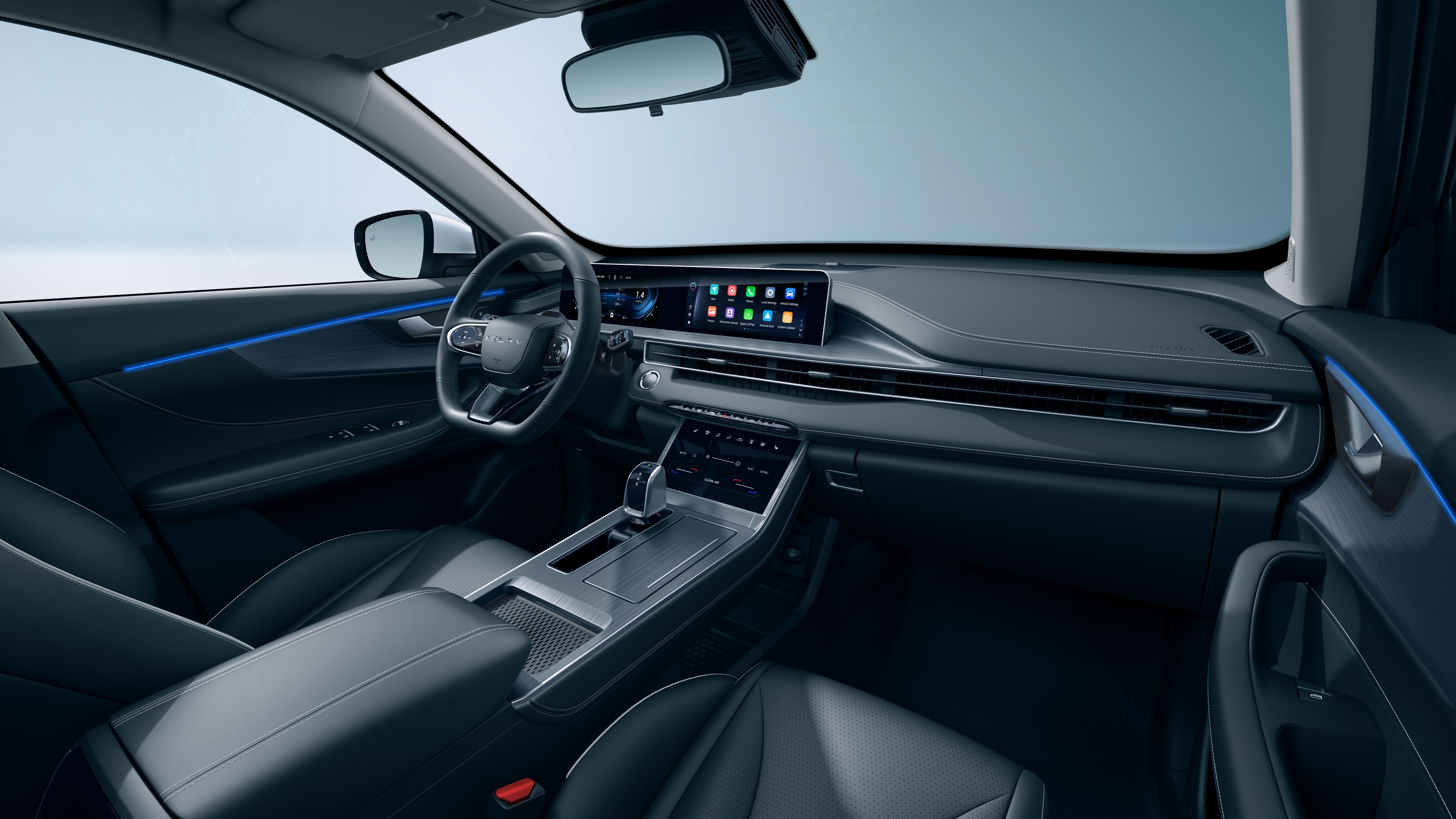 Po drugiej stronie skali Chery położył swojego flagowca. SUV-a segmentu D mierzące blisko ponad 4,8 metrów (rozstaw osi 2,8 m), z trzema rzędami siedzeń i napędem hybrydowym PHEV. Miejsca jest w nim dużo, fotele składają się eklektycznie, a wnętrze urządzone jest w tradycyjny sposób. Warto o tym wspomnieć, bo samochód zbudowano na tej samej platformie 2TX, co siostrzaną Omodą 9.
