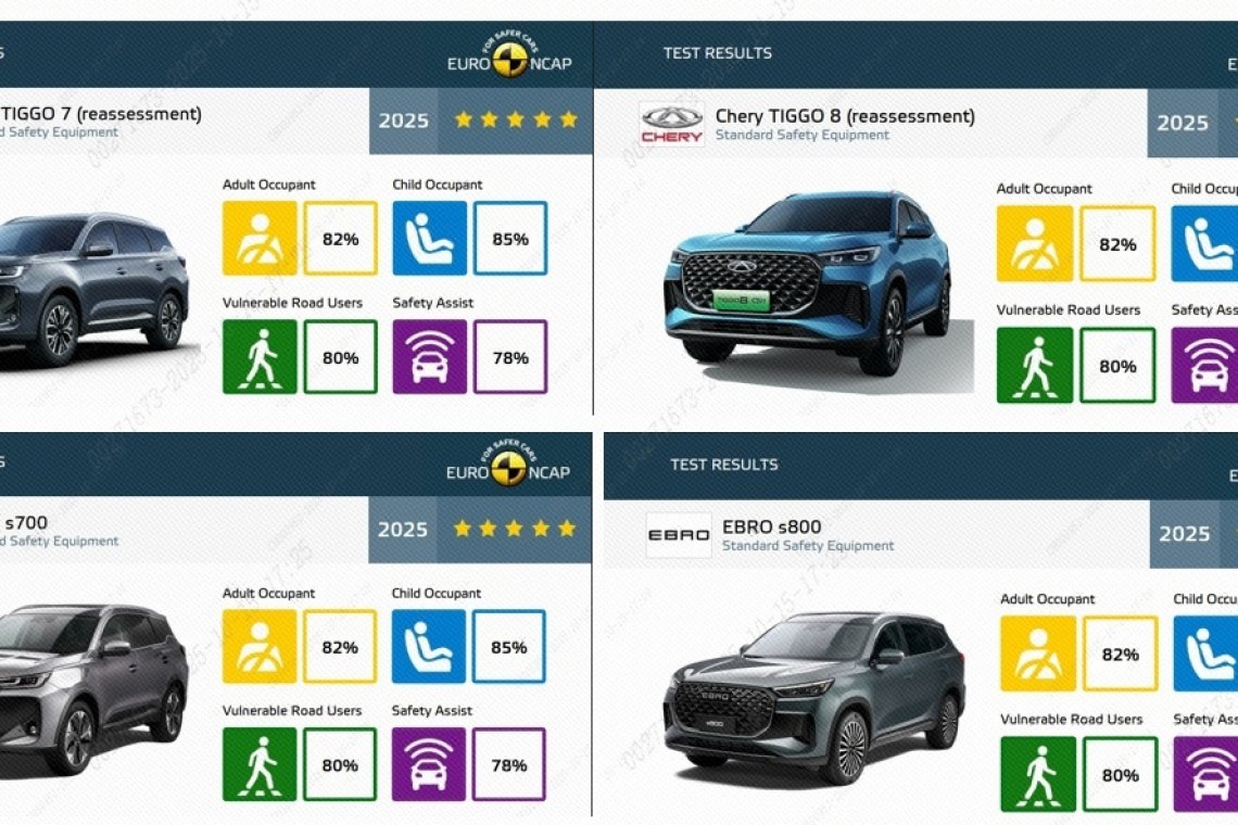 W najnowszej rundzie testów Tiggo 7 PHEV i Tiggo 8 PHEV osiągnęły najwyższy wynik pięciu gwiazdek. W małych punktach wyniki też wyglądają świetnie: 82% w kategorii Adult Occupant Protection, 85% w Child Occupant Protection, 80% w Vulnerable Road User Protection oraz 78% w Safety Assist.