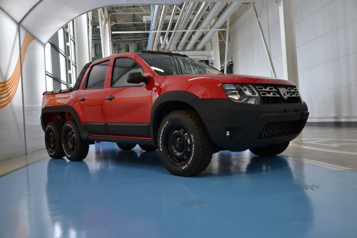Pikap Dustruck powstał w oparciu o podwozie klasycznego SUV-a Duster, w którym dołożono z tyłu kolejną oś. Tak powstały pojazd 6x4 może się okazać niekiedy nawet lepszym pomysłem na bezdroża (dzięki niskiej masie) niż G63 AMG. Tył prototypowego pojazdu pochodzi z modelu Logan Pick-up a na pakę załadujemy towary o masie nawet jednej tony. Dacia nie przewiduje jednak wprowadzenia prototypu Dustruck do produkcji.