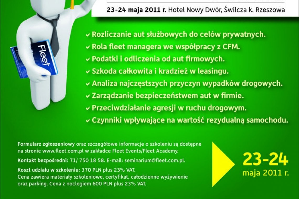 Czynniki wpływające na wartość rezydualną samochodu oraz floty samochodowej. Samochód w firmie – aspekty podatkowe. Podatki i odliczenia od aut firmowych. Teraz fleet manager, czyli rola szefa floty we współpracy z dostawcą CFM. A także inne tematy: Przyczyny najczęstszych zdarzeń drogowych. Prawo o ruchu drogowym oraz prawa i obowiązki zatrzymanego i organu kontrolującego. Zarządzanie bezpieczeństwem aut w firmie. Warsztaty teoretyczne z bezpiecznej i ekonomicznej jazdy dla flot samochodowych. Warsztat psychologiczny nt. radzenia sobie ze zjawiskiem agresji drogowej. Szczegóły szkolenia, informacje o prelegentach i prelekcjach na stronie szkolenia. Serdecznie zapraszamy do uczestnictwa w szkoleniu Fleet Academy.
