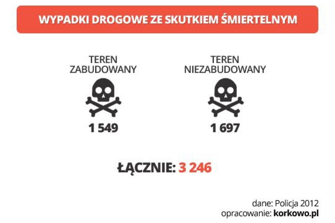Statystyki wskazują, że w Polsce średnio co jedenasty wypadek kończy się przynajmniej jedną ofiarą śmiertelną (Policja 2012 r.) To najtragiczniejszy rodzaj wypadków. Ofiary giną zwykle na miejscu zdarzenia. Kim są sprawcy? Gdzie najczęściej dochodzi do takich wypadków? Co jest ich przyczyną? Liczba wypadków ze skutkiem śmiertelnym (podobnie jak wypadków w ogóle) raczej maleje niż rośnie – idziemy w dobrym kierunku. Nie zmienia to jednak faktu, że w 2012 roku na polskich drogach doszło do 3 246 wypadków tego typu. Największe ich natężenie przypadło na jesienne miesiące. Październik i listopad odpowiadały za prawie 21% wszystkich wypadków ze skutkiem śmiertelnym. Jeśli chodzi o dni tygodni to największe żniwo zebrał początek weekendu – na piątki i soboty przypadała ok. 1/3 wszystkich wypadków. Amatorzy weekendowych imprez i wypadów powinni mieć się na baczności i nie dać się ponieść chwili. Wypadki ze skutkiem śmiertelnym to z reguły owoc jakiegoś rodzaju brawury: zwykle chodzi o nadmierną prędkość (prawie 70% wszystkich wypadków), nieudzielenie pierwszeństwa przejazdu, nieprawidłowe wyprzedzanie bądź też nieprawidłowe zachowanie wobec pieszego. Piesi uczestnicy ruchu drogowego przyczyniają się do wypadków ze skutkiem śmiertelnym choć robią to znaczenie rzadziej od kierowców (150 wypadków w 2012 r., dane Policja). Wolno i bezpiecznie?Które miejsca są statystycznie najbardziej niebezpieczne? Jak się okazuje między terenem zabudowanym a niezabudowanym nie ma kolosalnej różnicy. W 2012 roku doszło na nich do odpowiednio 1 549 oraz 1 697 wypadków ze skutkiem śmiertelnym. W terenie zabudowanym mamy też niższy wskaźnik osób zabitych na miejscu (996 wypadków vs. 1480 wypadków). Obszar zabudowany jest zatem teoretycznie bardziej bezpieczny. Dlaczego? – Na terenie zabudowanym obowiązuje ograniczenie prędkości do 50 km/h, co skraca drogę hamowania, a w rezultacie podnosi bezpieczeństwo jazdy – mówi Katarzyna Florkowska z serwisu Korkowo.pl. – W większych miastach zauważyć można trend do dodatkowego limitowania prędkości. W centrum Poznania mamy na przykład strefę ograniczającą prędkość pojazdów do 30 km/h. Warto zauważyć, że w dużych miastach prędkości pojazdów „trzymają" też uliczne korki. Według naszych badań w większości miast wojewódzkich średnia prędkość pojazdów nie przekracza 39 km/h. – dodaje Florkowska. Uwaga na województwaJak wygląda sytuacja w poszczególnych województwach? Bywa różnie. Największy odsetek wypadków ze skutkiem śmiertelnym w roku 2012 wystąpił w woj. mazowieckim (367 wypadków; dane Policja). Na drugim miejscu uplasował się woj. śląskie (306 wypadków), na trzecim zaś woj. wielkopolskie (279 wypadków). Statystycznie najmniej śmiertelnych wypadków zdarzyło się w woj. opolskim (76) oraz lubuskim (83).Źródło: Creandi.pl